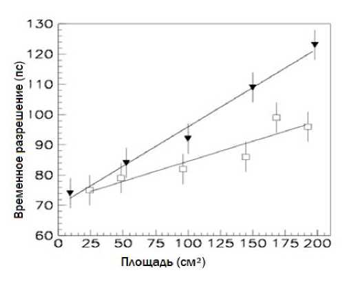 Временное разрешение как функция площади считывающего электрода при оптимальном напряжении 6.2 кВ показано на рис. 3.
