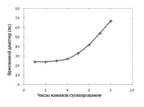 Рис. 5. График зависимости собственного временного джиттера суммирующего предусилителя от количества подключенных входов при величине входного заряда Qвх = 120 фКл.
