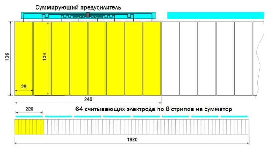 Рис. 7. Структура считывания камеры МРПС длиной 1920 мм, содержащей 64 считывающих стрипа размером 29×104 мм², структурированным по 8 стрипов для считывания суммирующим предусилителем.
