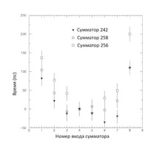 На рис. 10 показана зависимость временного разрешения восьми считывающих электродов внутри одной группы суммирования [3]. Из анализа графиков следует, что по временному разрешению каналы сумматора идентичны. Однако при одинаковой длине трасс, соединяющих сигнальные стрипы с точкой суммирования, задержка времени по входам оказалась различной.