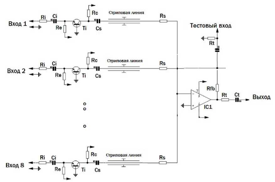 Принципиальная электрическая схема суммирующего предусилителя на 8 входов для времяпролетных камер МРПС представлена на рис. 9. Предусилитель состоит из восьми буферных каскадов на малошумящих транзисторах (Phillips BFR92A, 5GHz), построенных по схеме с общей базой. Назначение этих каскадов состоит в преобразовании низкого импеданса считывающих стрипов 12–14 Ом в сопротивление полосковой линии 55 Ом, передающей сигнал в точку суммирования.
