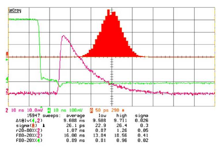 Таким образом, задачу суммирующего усилителя удалось свести к суммированию 8 падов при высокой точности суммирования сигналов только с двух входов. При такой постановке задачи оказалось возможным создать предусилитель, обладающий низким собственным джиттером, показанным на рис. 11, даже при суммировании 8 электродов. На практике его принцип действия можно считать промежуточным между аналоговой функцией суммирования и цифровой функцией ИЛИ.
