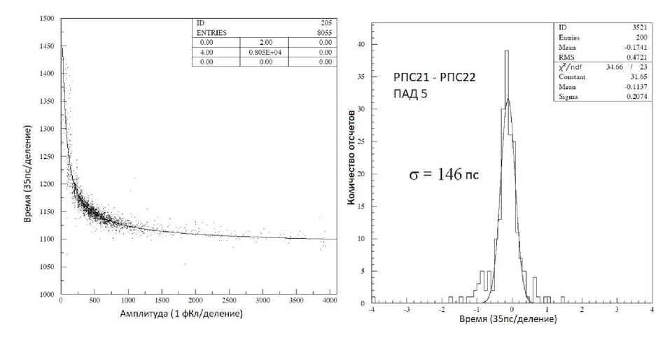 Рис. 12. Результаты тестов на пучке мюонов с энергией 6 ГэВ на тестовом канале Т₁₀ ускорителя PS. Слева зависимость времени срабатывания от амплитуды сигнала, справа гистограмма разности времен двух последовательных по пучку камер МРПС21 и МРПС22 по среднему электроду 5.