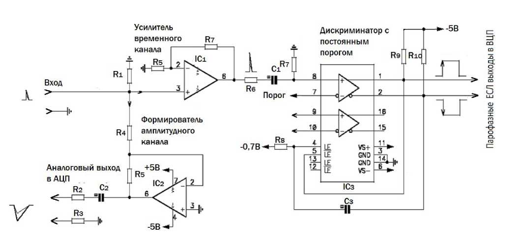 Схема одного канала с регулируемым порогом в диапазоне от 0.5 мВ до 5 мВ показана на рис. 14.