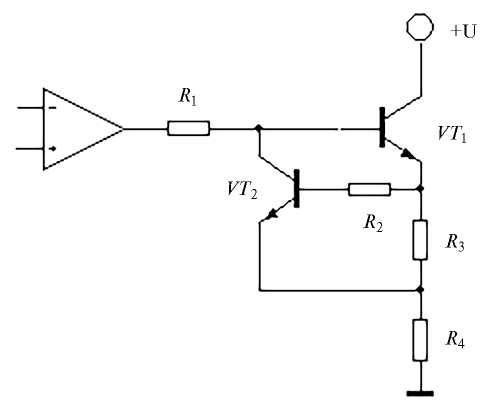 Защита транзисторов мощных выходных каскадов (эмиттерных повторителей) источников напряжения от тока короткого замыкания обычно осуществляется путем принудительного уменьшения напряжения на их базах при превышении эмиттерным током максимально допустимой величины. Классическая реализация ограничения выходного тока с помощью дополнительного транзистора поясняется схемой рис. 1 [1–3].