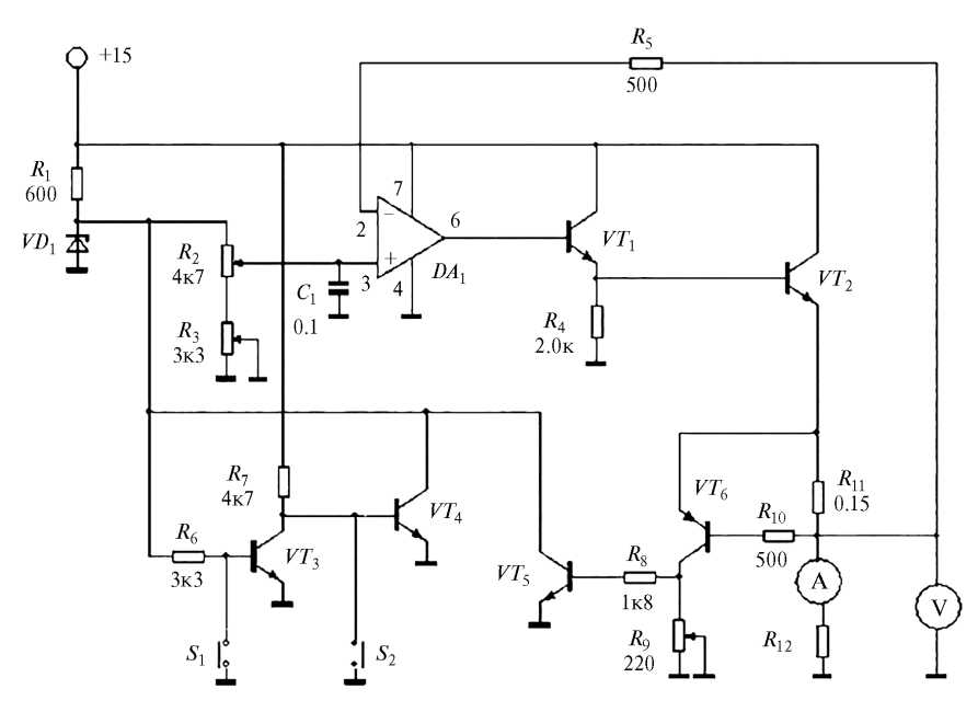 При превышении выходного тока заданной величины открывается ключ VT5 и за счет этого стабилитрон VD1 замыкается на землю. Напряжения на неинвертирующем входе DA1, эмиттере VT2 и нагрузке уменьшаются. Кроме того, размыкается ключ VT3, замыкается ключ VT4, и за счет этого напряжение на стабилитроне VD1 поддерживается на уровне не более 0.1 В. Возобновление работы источника осуществляется нажатием кнопки S2. При этом размыкается ключ VT4, и падение напряжения на стабилитроне VD1 восстанавливается до исходной величины 9.1 В.