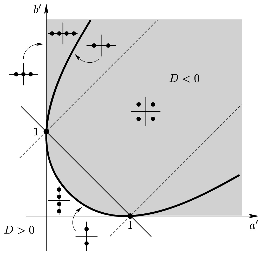 Для задачи об устойчивости наличие множителя не играет никакой роли. Диаграмма степеней устойчивости на плоскости параметров a′, b′ изображена на рис. 1. Дискриминантная кривая (где дискриминант D = (a′ — b′)2 — 2(a′ + b′ + 1) обращается в нуль) является параболой, которая касается осей a′ и b′ точках (1, 0) и (0, 1) соответственно. В каждой из областей изображено расположение собственных значений (кратные собственные значения более «жирные»). Точки a′ = 1, b′ = 0 и a′ = 0, b′ = 1 отвечают нулевому корню кратности 4. Рисунок наглядно показывает смену расположения характеристических корней при переходе через бифуркационные кривые. Область параметров, отвечающих полной неустойчивости системы (4.1), заштрихована. Кстати сказать, области устойчивости и неустойчивости, а также области флаттера и дивергенции сразу же определяются из заключений теорем 4 и 5 (и их следствий).