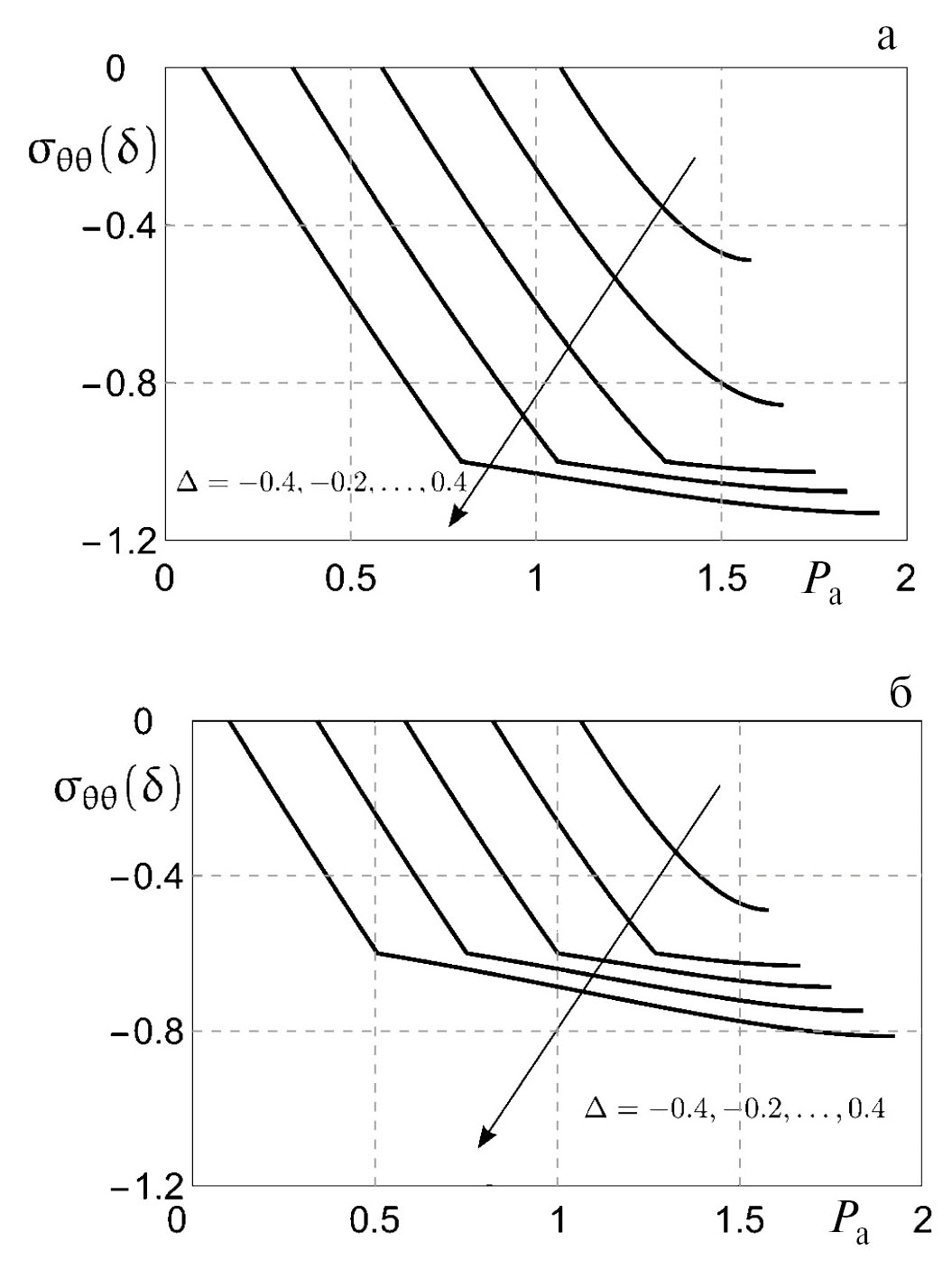 Рис. 6. Максимальное тангенциальное (а) и эквивалентное (б) напряжение в сфере в зависимости от технологического давления Pa и градиента температуры для и .
