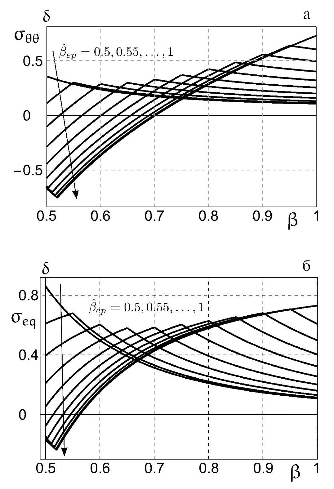 Зависимости предельного давления , соответствующего началу течения (3.7), и давления , при котором вся сфера переходит в пластическое состояние (4.9), от градиента температуры изображены на рис. 1. Интересно отметить, что увеличение температурного градиента в сфере приводит к значительному увеличению диапазона возможных значений технологического давления . В то же время при отрицательных и высоких по модулю значениях градиента сфера относительно быстро переходит в пластическое состояние. Следовательно, чем выше температурный градиент, тем более высокие значения пластических деформаций в окрестности внутренней поверхности могут быть достигнуты в ходе нагрузки, и тем выше абсолютная величина остаточных сжимающих напряжений после разгрузки. Однако данное заключение в полной мере справедливо только для чисто упругой разгрузки. На рис. 1 также представлены зависимости давления от градиента температуры для нескольких значений параметра . Видно, что эффект Баушингера существенно ограничивает область параметров , при которых разгрузка является чисто упругой, что в особенности характерно для положительных значений температурного градиента. При отрицательном градиенте возможно достичь упругой разгрузки даже при очень выраженном эффекте Баушингера.