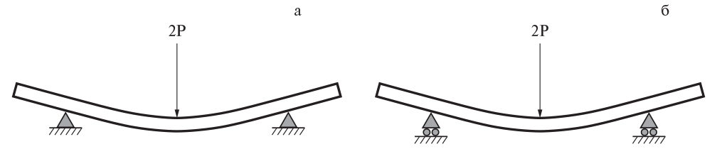 - Постановка задачи. Балка прямоугольного сечения из пористого металла установлена на двух опорах, как это показано на рис. 1, и находится под действием сосредоточенной силы 2Р. Длина балки равна 2l, опоры удалены от середины (точки приложения силы) на расстояние . Опоры могут быть неподвижными (рис. 1, а) или скользящими (рис. 1, б). В первом случае балка соскальзывает с них в точках контакта. Во втором случае скольжения не происходит и опоры перемещаются вместе с изгибаемой балкой. Предполагается, что толщина балки многократно превышает характерный размер пор. Материал считается билинейным. Модуль упругости при растяжении и при сжатии до момента схлопывания пор обозначается через , после схлопывания – через . Если значение действующей силы ниже некоторого критического значения , то схлопывания пор пористого скелета не происходит, и реализуется классическое решение задачи трехточечного изгиба с модулем упругости . Если значение выше критического, то в окрестности точки приложения силы образуется зона схлопывания пор, которая увеличивается с ростом P, распространяясь по направлению к срединной оси балки и к опорам. Зоны схлопывания могут образовываться также в окрестности опор за счет сжатия под действием сил реакции, но этот эффект в математической модели не рассматривается.