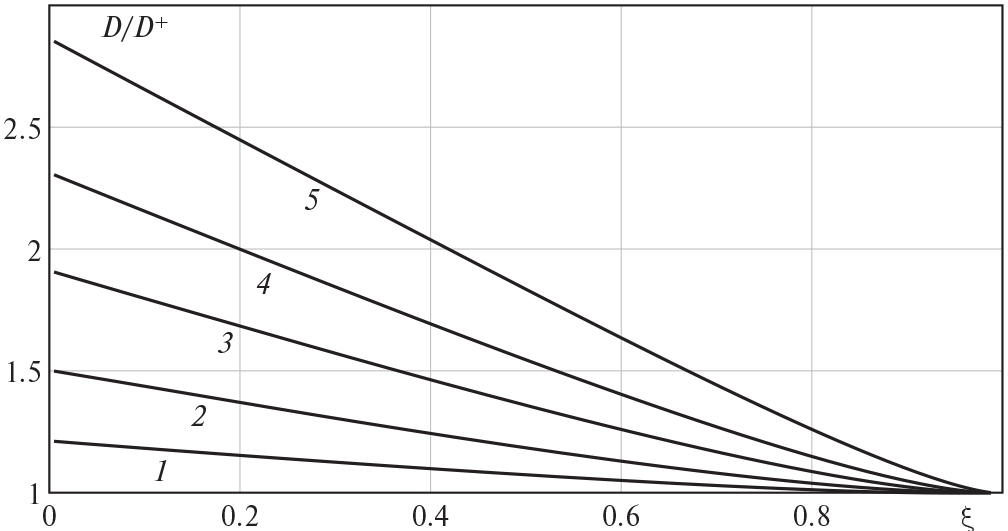 Рис. 5. Зависимость безразмерной толщины от параметра для (кривые 1–5, соответственно).