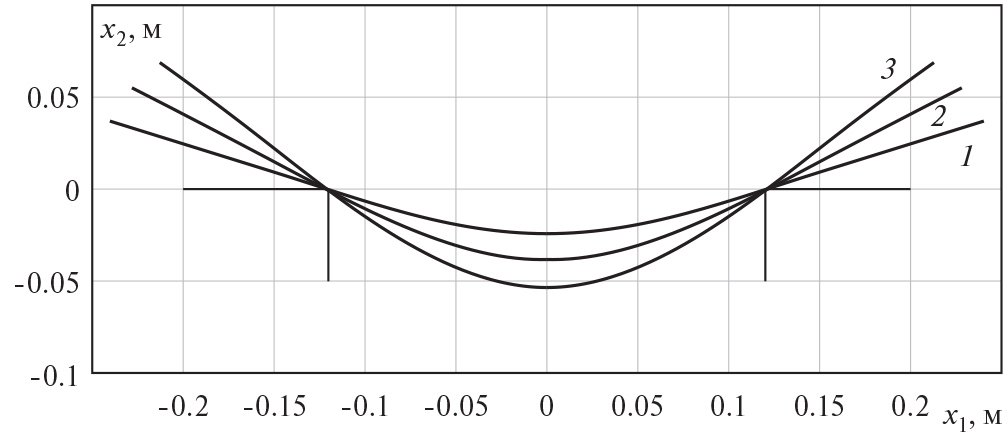 Рис. 7. Расчетные прогибы балки: 1 – алюминий; 2 – пористый алюминий; 3 – пористый алюминий, без учета уплотнения.