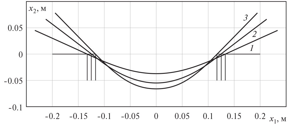 Полученное уравнение соответствует физически и геометрически нелинейной модели изгиба. Форма изогнутой оси балки определяется через решение задачи (2.5), (2.6) с учетом граничных условий симметрии относительно середины: и отсутствия изгибающего момента на правом конце: . Зависимость изгибной жесткости от длины дуги задается формулой (2.3) совместно с уравнением: , которое следует из определения кривизны. Если опоры неподвижны, то величина находится из условия: при . Если опоры скользящие, то из этого же условия определяется расстояние при фиксированном значении . В безызгибном положении балки принимается равным половине расстояния между опорами.