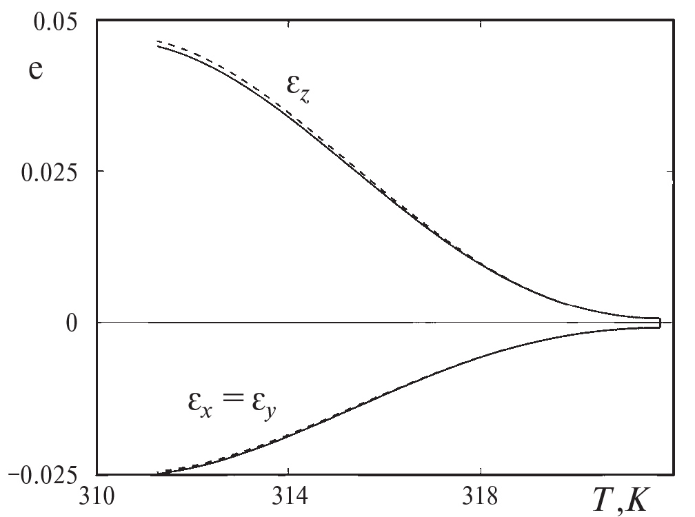 Формула для производной dq/dt получается с учетом зависимостей (6.3) и (6.5), а также определяющих соотношений (3.4) и (3.6). После определения зависимости от времени интенсивности фазово-структурной деформации по формуле (6.10), компоненты фазово-структурной деформации вычислялись по формуле (6.4), упругие деформации определялись по закону Гука с учетом переменности модулей при фазовом переходе по формулам (3.1). На рис. 1 сплошными линиями представлены графики полученных таким образом зависимостей деформаций и от температуры для случая МПа, МПа, , , что соответствует значению параметра вида напряженного состояния . Там же штриховыми линиями изображены результаты полученного с помощью разработанной процедуры численного решения задачи о деформировании цилиндра, находящегося в состоянии равнодвухосного сжатия по граням, перпендикулярным осям x и y в отсутствии внешней нагрузки по граням, перпендикулярным оси z. Как видно, получено неплохое совпадение результатов численного решения и решения в квадратурах.