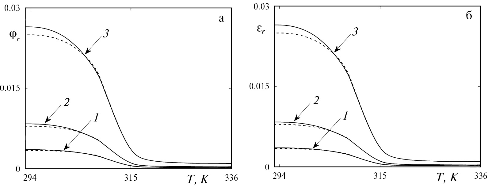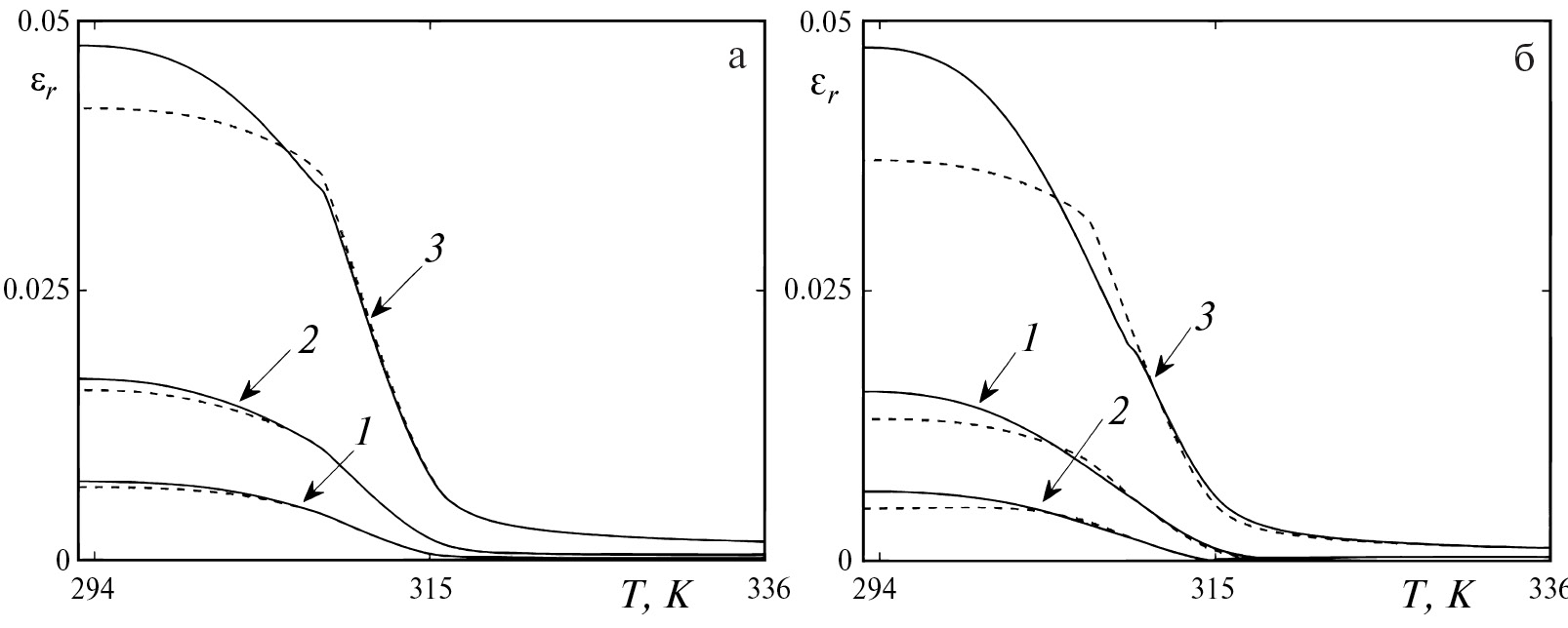 На рис. 4, а, б и 5, а, б представлены графики зависимостей модулей кольцевых (рис. 4) и радиальных (рис. 5) деформаций для случая (а) –внутреннего и (б) – внешнего давления от температуры. Согласно приведенным рисункам, в процессе прямого превращения во всех сечениях наблюдается существенный рост модулей деформаций и модулей значений радиальных смещений, отнесенных к радиальной координате соответствующих точек, особенно заметный на внутренней поверхности оболочки. Учет структурного перехода приводит к дополнительному росту деформаций и смещений, особенно существенному на завершающей стадии прямого превращения и наиболее значительному в случае действия внешнего давления. Влияние структурного перехода более значительно для радиальных деформаций, чем для кольцевых.