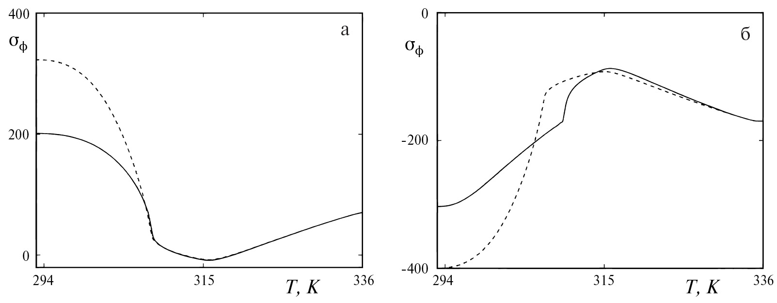 Ранее задачи о перераспределении напряжений при прямом превращении в случае действия изгибающих или крутящих моментов [16, 17] решались без учета структурного механизма деформирования. Поэтому далее особое внимание обращается на влияние учета структурного деформирования на результат решения. Поэтому в приведенных ниже графиках сплошные кривые соответствуют учету упругого, фазового и структурного деформирования, а штриховые – решению, где учитывается, наряду с упругим, только фазовый механизм. Из каждой пары приведенных ниже рисунков: а соответствует случаю действия внутреннего давления; б – внешнего давления. Напряжения отложены по осям графиков в МПа, температура – в Кельвинах.