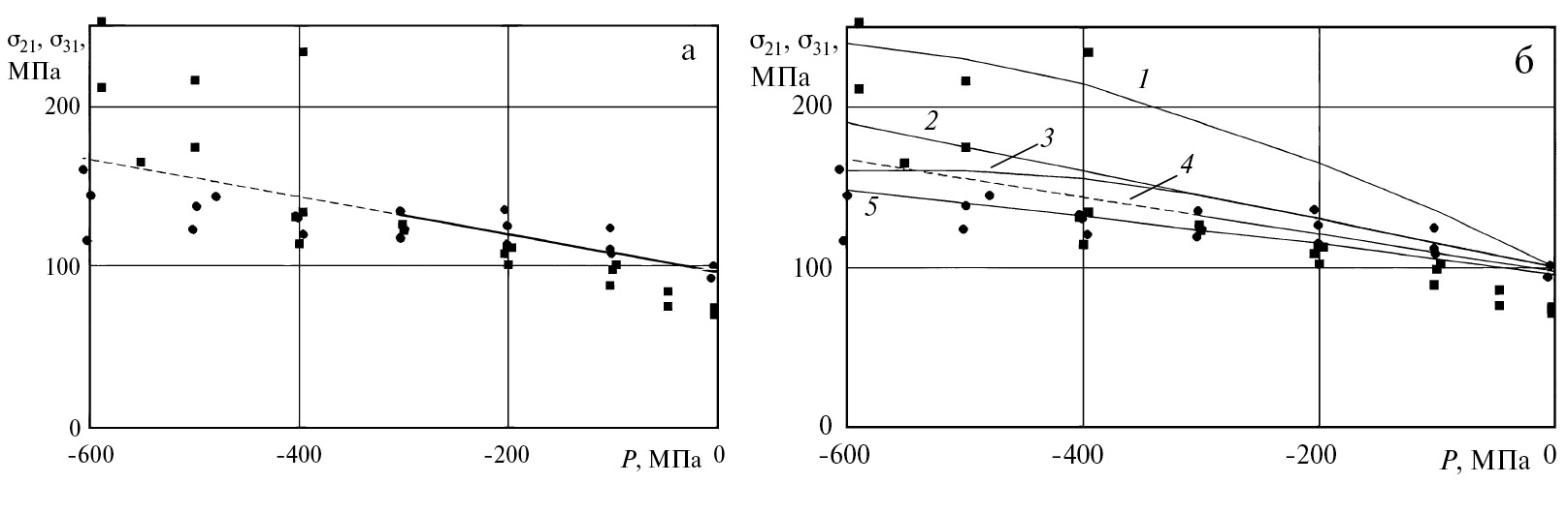 7.1. Объемное напряженное состояние. На рис. 1 представлены экспериментальные данные по разрушению однонаправленного углепластика T300/PR319 в двух случаях объемного напряженного состояния, которые реализуются в толстостенных трубчатых слоистых образцах приложением к ним давления p и торцевого крутящего момента [21, 22]. Эти состояния отвечают действию комбинации нормальных сжимающих напряжений и одного из касательных напряжений: либо (90°-трубка, монослои (волокна) уложены в окружном направлении, (кружки)), либо (0°-трубка, монослои (волокна) уложены в осевом направлении, (квадратики)) [21, 22]. В обоих случаях исходный материал слоев (препрег) и геометрия образцов были идентичны, однако технологии их изготовления были различны. Поэтому авторы предупредили о том, что соответствующие измеренные механические величины этих образцов нельзя сопоставлять. Для сравнения с теорией мы будем использовать данные по разрушению 90°-трубки.