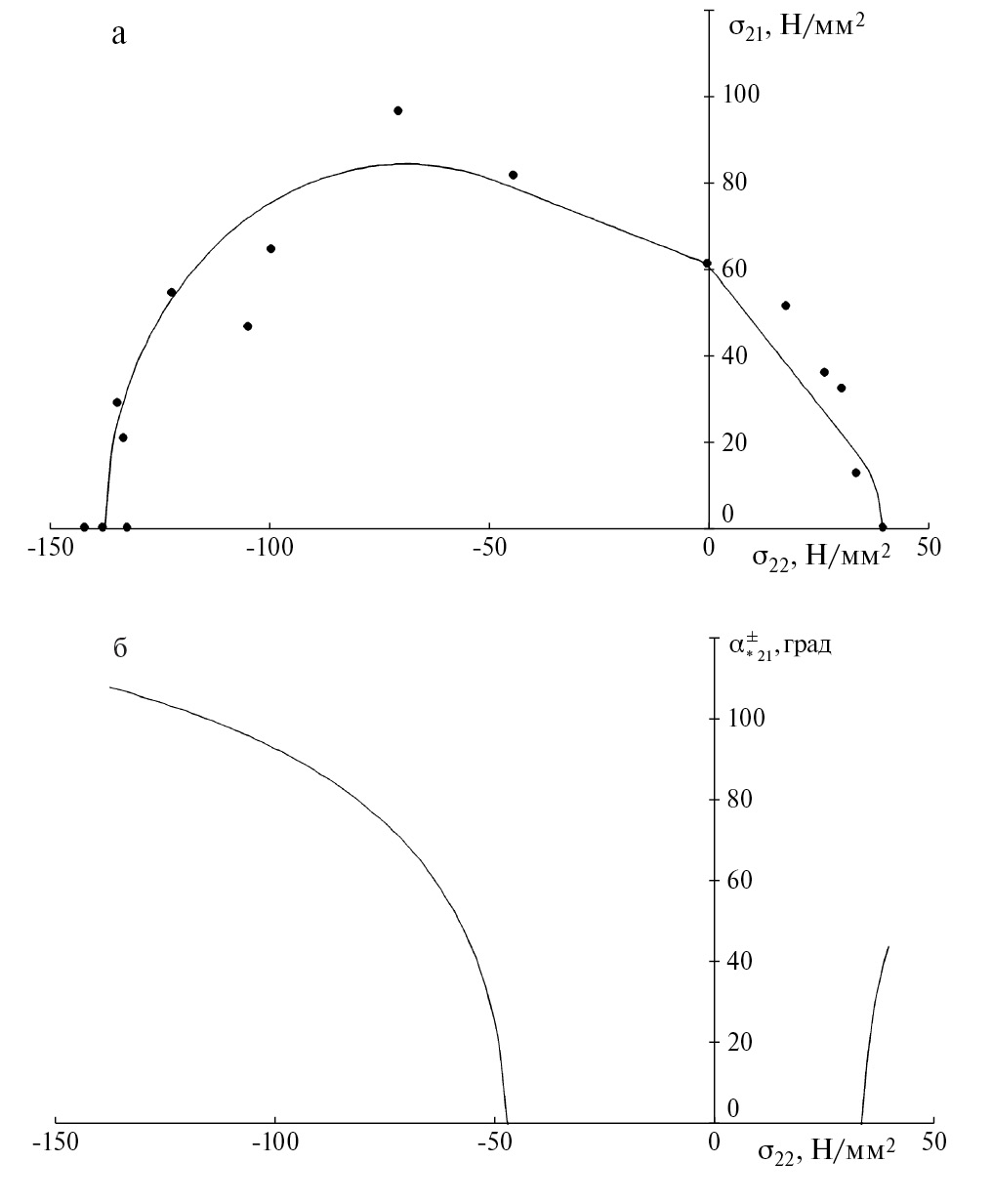 Рассчитанный по (5.3), (5.4) предел прочности данного композита описывается на плоскости линией, хорошо согласующейся с массивом экспериментальных точек, имеющих определенный разброс (рис. 2, а). Рассчитанный по формуле (5.2) график изменения угла , наклона критической площадки в зависимости от поперечного напряжения приведен на рис. 2 б. На нем видно, что эта зависимость непрерывна, а также то, что на отрезке МПа () критическая площадка перпендикулярна плоскости волокон – . На этом отрезке применялся критерий (5.3), вне его – критерий (5.4). Вне данного отрезка наклон площадки меняется от нуля до при увеличении поперечного сжатия, и также от нуля до при росте поперечного растяжения. Непрерывный переход от скола матрицы в плоскости ортогональной к плоскости волокон, который описывается линейным критерием (5.3), к сколу вдоль волокон в наклонной плоскости, который описывается квадратичным критерием (5.4), происходит при отношении касательных напряжений к сжимающим поперечным и при при растягивающих поперечных напряжениях.