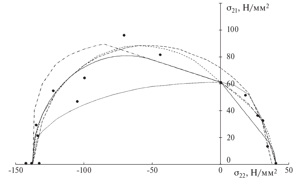 Графики прочности , рассчитанных по (5.3), (5.4) (сплошная линия) и по критериям [30, 31] – линия длинных пунктиров, [32] – точечная линия, [7] – линия коротких пунктиров, [33] – штрихпунктирная линия, представлены на рис. 3. На этом рисунке видно, что в области сжимающих напряжений более простой критерий (5.3), (5.4) оказался в лучшем соответствии с опытными данными, чем критерии [30–33], и примерно в таком же соответствии, как и критерий [7]. При наличии растягивающих напряжений критерии (5.3), (5.4) и [30, 31] также примерно одинаково соответствуют опыту. Критерий (5.3), (5.4), как и ожидалось, обеспечивая запас прочности, здесь дает более консервативную оценку прочности, чем критерии [7, 32, 33].