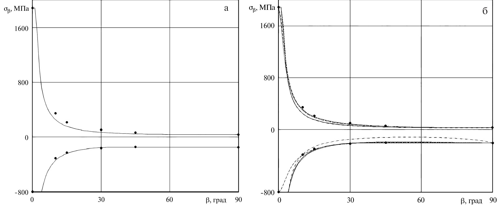 7.3. Одноосное осевое и внеосевое растяжение-сжатие. Данные испытаний статической прочности плоских образцов, вырезанных из слоистого однонаправленного углепластика T700S/2592 в шести направлениях под углами к оси волокон, представлены на рис. 4, а, б (кружки) [20].