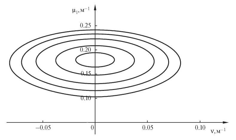 На рис. 4–7 приведены результаты расчеты фазовых картин, которые показывают, что в зависимости от основных параметров волновой генерации возбуждается одновременно от одной до трех волновых систем, отвечающим соответствующим ветвям дисперсионных соотношений. На рис. 4 приведены результаты расчетов линий равной фазы для и . Волновая картина представляет собой систему кольцевых волн, распространяющихся от источника. На рис. 5–7 приведены результаты расчетов линий равной фазы для , (рис. 5, 6), (рис. 7), которые отвечают нижней (рис. 5), средней (рис. 6) и верхней (рис. 7) ветвям дисперсионных соотношений соответственно. На рис. 5 изображена достаточно сложная волновая картина, состоящая как их продольных, так и поперечных волн, уходящих от источника возмущений вверх по потоку. Направление распространения волн в этом случае определяется знаком дисперсионных кривых: для любых значений n. На рис. 6 представлена волновая картина кольцевых волн, которые эволюционируют от источника вниз по потоку. На рис. 7 изображена в волновая картина, которая представляет собой систему только клиновидных волн, распространяющихся от источника вниз по потоку. Численные расчеты демонстрируют также достаточно заметную перестройку фазовых картин при изменении частоты .
