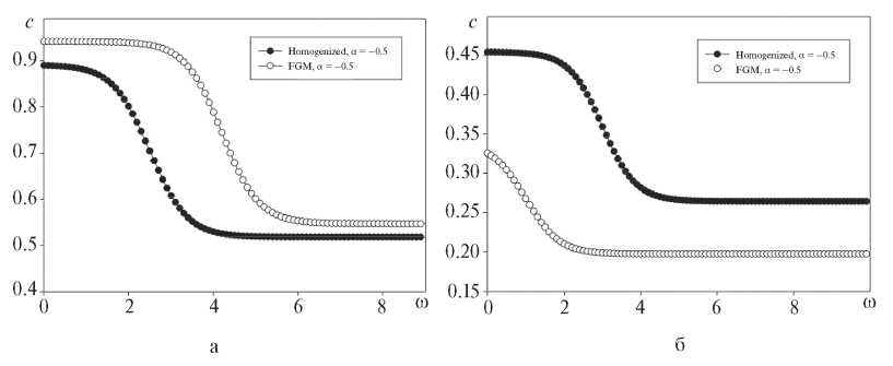 Применение метода, разработанного в разд. 3, и подстановка изотропного тензора упругости, определяемого формулой (5.3) и постоянными (5.6), позволяет представить дисперсионные кривые для рассмотренных ФГ- и гомогенизированных слоев; см. рис. 3.