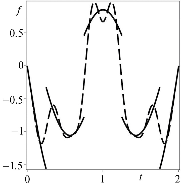 Рис. 4. Сила для и : точное решение (сплошная кривая) и 8-модовое приближение (штриховая кривая).