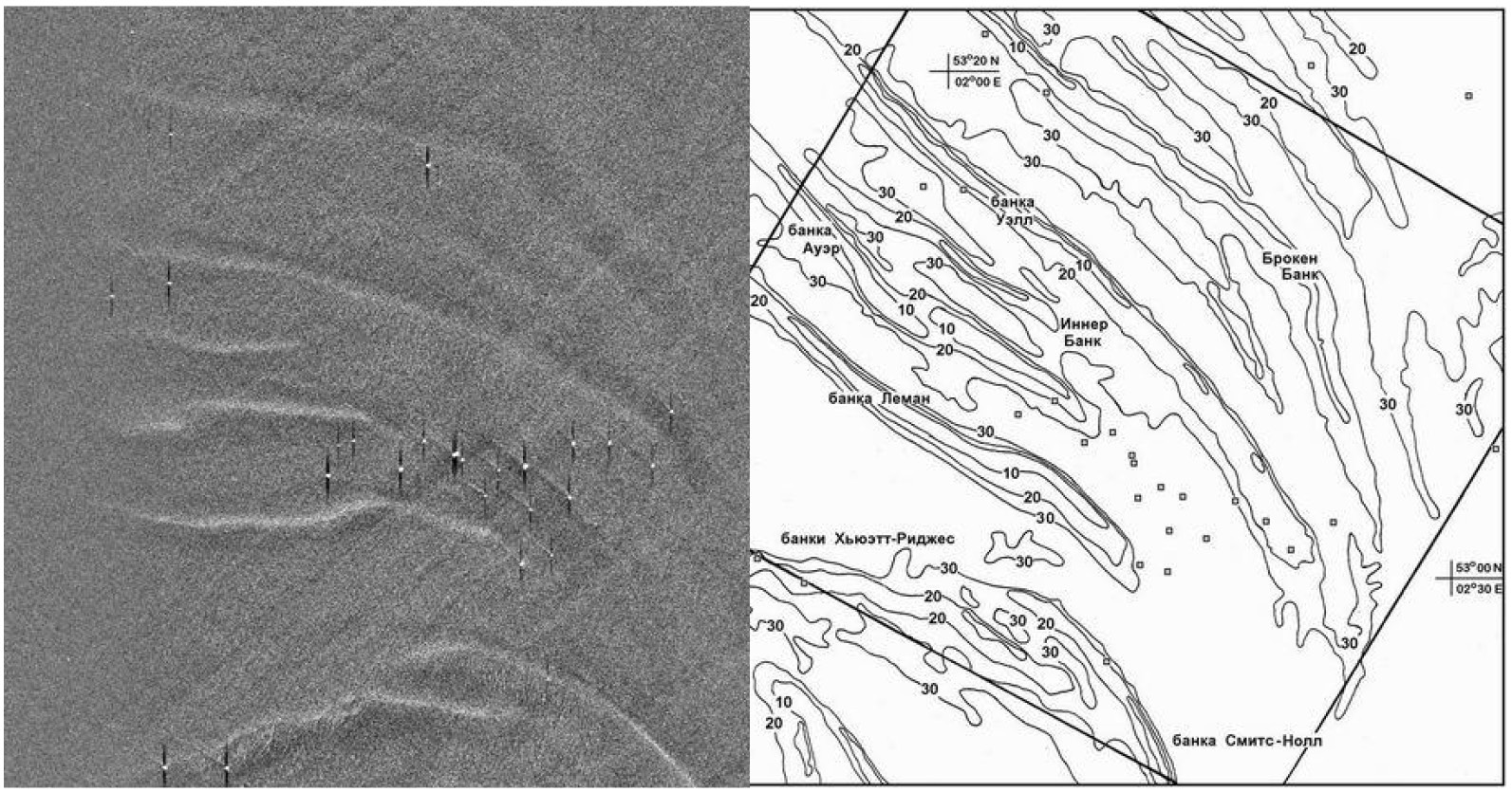 Рис. 1. Радиолокационное изображение, полученное с помощью космического аппарата “Алмаз-1” в Северном море и батиметрическая схема участка съемки