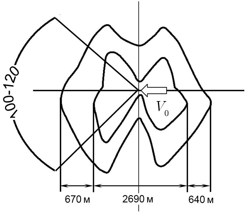 Вернемся к картине возмущения поверхностных волн, полученной с помощью радиолокатора вертолетного базирования, представленной на рис. 5. Кроме того, известна экспериментальная картина трансформации ветровых волн с групповыми скоростями м/с, м/с, м/с с длинами волн, соответственно м, м.