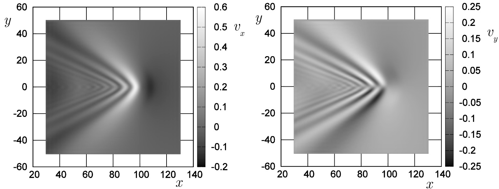 Далее приводится пример расчета поля скоростей, вызванного движущимся источником [14] в координатном и спектральном представлении (см. рис. 7, 8). С помощью него можно осуществить моделирование возмущения поверхности также в спектральном и координатном представлении. Для этого нужно воспользоваться формулой (4.1). Именно, нужно получить картину поверхностного поля скоростей в спектральном представлении, сдвинуть эту картину на постоянный волновой вектор возмущаемой ветровой волны и, далее, умножить на передаточную функцию (которая, заметим при этом, имеет особенности на целой линии). Затем осуществляется переход к исходным координатам , описанным выше методом.