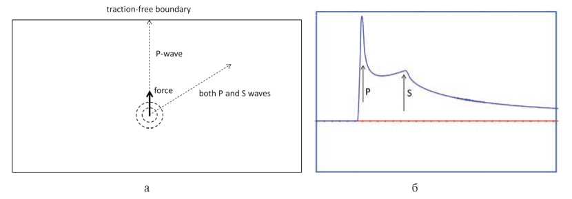Рис. 1. а) Схема внутренней задачи Лэмба для вертикального силового воздействия в виде временного δ-образного импульса; б) Сейсмограмма на линии действия силовой особенности [25], показывающая наличие пика на сейсмограмме вертикальной компоненты перемещений, отвечающего приходу S-волны
