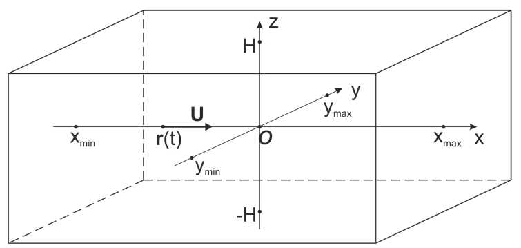 Источник возмущения движется равномерного и прямолинено со скоростью V в неограниченной области, то есть его движение описывается функцией r (t) = x0 + Ut, где |U| = V. В этом случае известны ассимтотики дальнего поля для скорости жидкости v, когда источник движется горизонтально [13] или под фиксированным углом к горизонту [14].