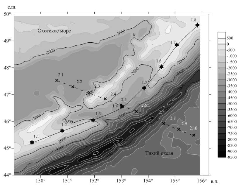 На рис. 1 приведены два профиля 1.1–1.8 и 2.1–2.10, расположенные в квадрате 149.0° ÷ 156.0° в.д., 45.0° ÷ 50.0° с.ш.