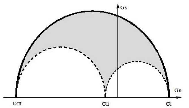 Для изучения напряженного состояния заданного квадрата разложим симметричную часть sin (2.1) несимметричного тензора напряжений Пиола–Кирхгофа tim (2.2). Для поверхности второго порядка в каждой текущей точке всегда можно выбрать такие направления координатных осей, для которых на трех взаимно перпендикулярных плоскостях касательные компоненты симметричного тензора напряжений sin обращаются в нуль. Эти плоскости называются главными плоскостями, а напряжения (σI, σII, σIII), действующие на них – главными напряжениями, т.е. в каждой текущей точке вместо девяти компонент тензора напряжений получаем три компоненты с важным физическим свойством. Главные напряжения определяют экстремальные направления всего комплекса напряжений. На главных площадках главные напряжения принимают свои экстремальные значения – максимум σI, минимум σIII и минимакс σII (σI > σII > σIII) [22]. Если в текущей точке известны все компоненты тензора напряжений, то соответствующие главные направления и главные напряжения вычисляются через решение кубического характеристического уравнения, составленного на основе определителя компонент тензора sin [5]. По определению, растягивающее напряжение считается положительным, сжимающее – отрицательным.