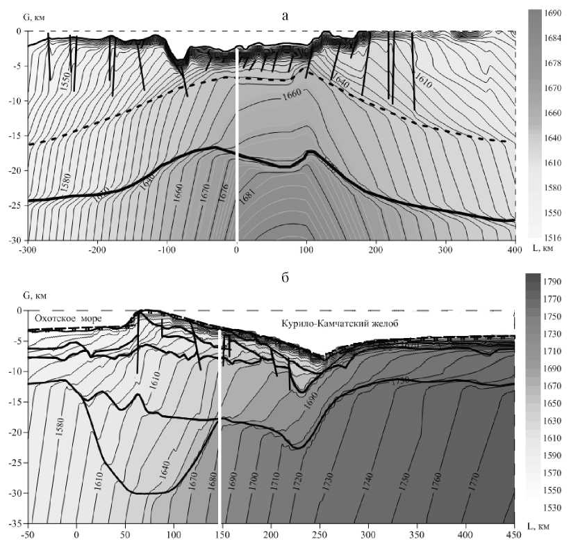 - На рис. 4, б пространственное распределение изолиний интенсивности напряжений и более насыщенная окраска на юго-восточной границе профиля моделирует потенциальную возможность бокового давления «поддвигающейся Тихоокеанской плиты, создающей зону сжатия, повышение плотности геологической среды в пределах уклона Курильского желоба и, как следствие, возникновение зоны повышенных напряжений. По мере удаления от указанной зоны в сторону Охотского моря, величина интенсивности напряжений, естественно, должна уменьшаться…» [18], что подтверждается более светлой окраской верхней части вдоль всего профиля на рис. 4, б.