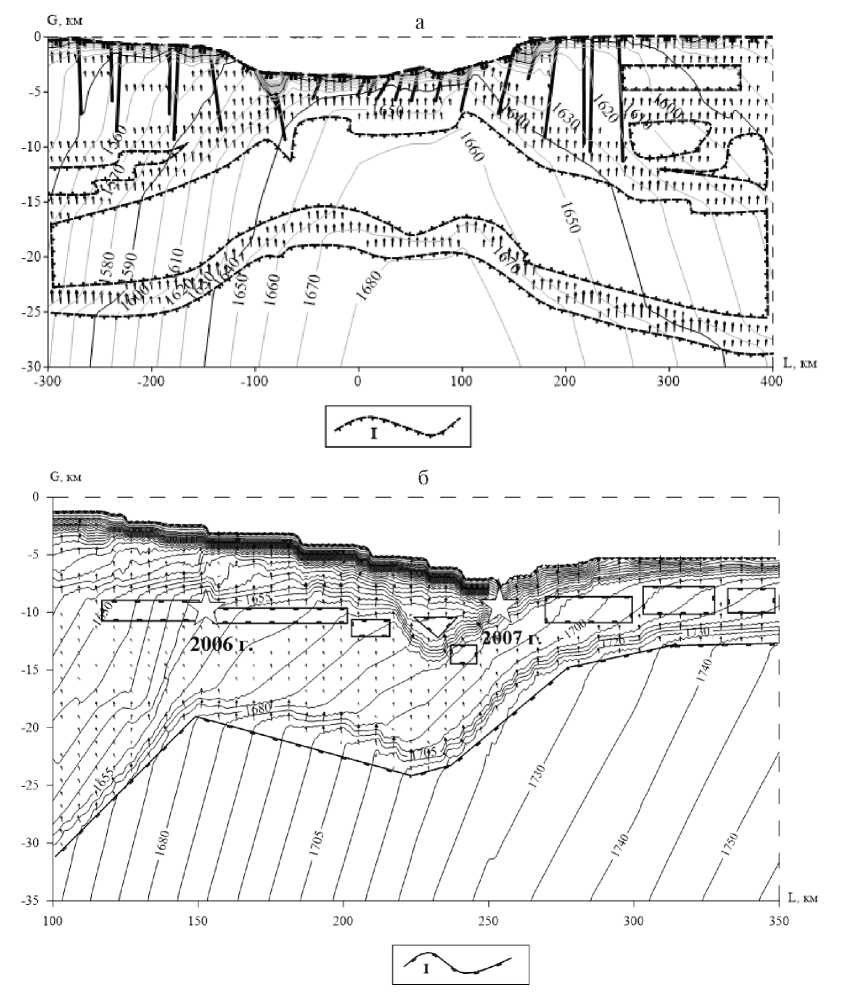 - На рис. 4а пространственное распределение изолиний интенсивности напряжений моделирует положение профиля в зоне растяжения, на глубине ниже –20 км на протяжении –40 км < L < 200 км моделируется часть океанической плиты профиля 2.1–2.10, НДС которой характеризуется сжатием с юго-востока на северо-запад.