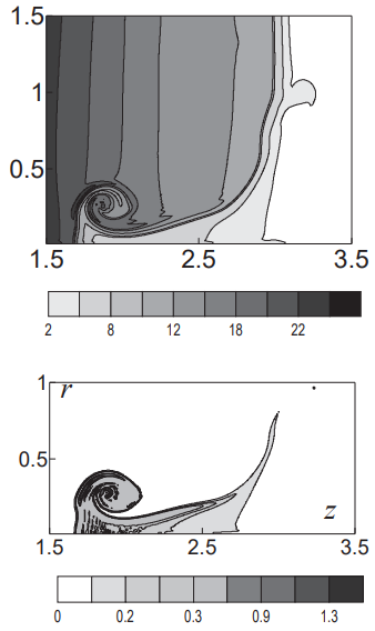 Расчеты проникновения неоднородного облака в слой проводились с использованием разностных схем второго порядка аппроксимации типа Лакса–Вендроффа и Лакса–Фридрихса. Выбирались цилиндрическая система координат (z,r) и равномерная прямоугольная сетка с одинаковым по координатам шагом. Расчеты выполнялись в области (0 ≤ z ≤6; 0 ≤ r ≤3). Шаг сетки составлял 5·10–3, так что разрешение было примерно таким же, как в работе [17].