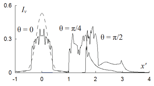 Характерные зависимости Iν(xʹ) представлены на рис. 6 и 7 для углов ϑ = 0, π/4, π/2. Видно, что на стадии формирования полости (t = 8 на рис. 6) максимум Iν(xʹ) заметно уменьшился по сравнению с его величиной при t = 0, а при ϑ = π/2 хорошо проявляются сжатое «ядро» и присутствие полости в промежутке изменения xʹ от 2 до 3. Для стадии возникновения струи (t = 14 на рис. 7) характерно существенное увеличение максимума Iν(xʹ) в направлении оси симметрии, являющееся следствием большого возрастания плотности в «ядре».