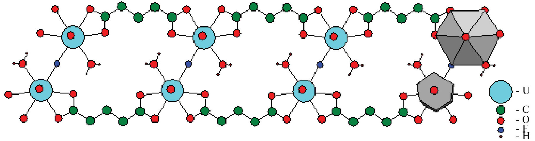 Рис. 3. Фрагмент ленты [UO2(C5H6O4)F]–с кристаллохимической формулой AQ02M2 в структуре II или III. Атомы H глутарат-ионов для упрощения рисунка исключены. Для атомов U на правом конце фрагмента указана проекция КП — гексагональной бипирамиды (вверху) и дуального ПВД — гексагональной призмы (внизу).