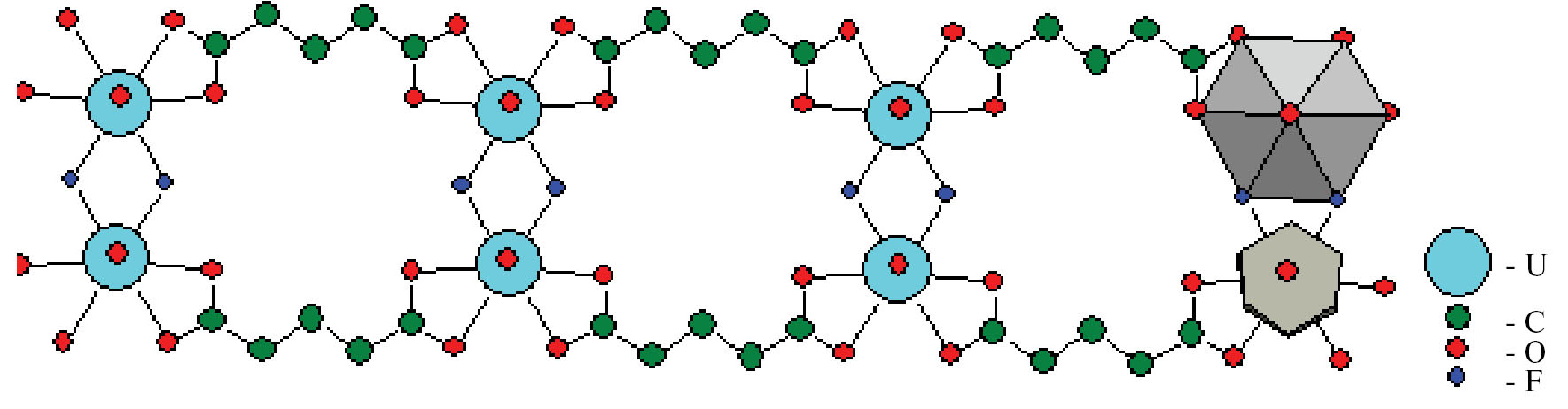 Ситуация изменяется при наличии в реакционной среде мостиковых лигандов, например фторид-ионов, способных связывать сразу два атома урана (тип координации М2). При высокой концентрации таких лигандов в процессе комплексообразования они могут заполнить все имеющиеся позиции 🞎. В этом случае вещество приобретет состав [UO2(C5H6O4)(F2/2)]– = [UO2(C5H6O4)F]–, а возникшие сшитые цепи (т. е. ленты) будут иметь строение, показанное на рис. 3. Если же концентрация мостиковых лигандов M2 недостаточно высокая, то возможна ситуация, при которой они занимают только половину позиций 🞎, а другую половину заполняют концевые лиганды M1 (например, молекулы Н2О). В этом случае вещество приобретет состав [UO2(C5H6O4)(F)1/2(Н2О)1/1]0.5– = [UO2(C5H6O4)F0.5(Н2О)]0.5–, а возникшие сшитые цепочки (т. е. ленты) будут иметь строение, показанное на рис. 2.