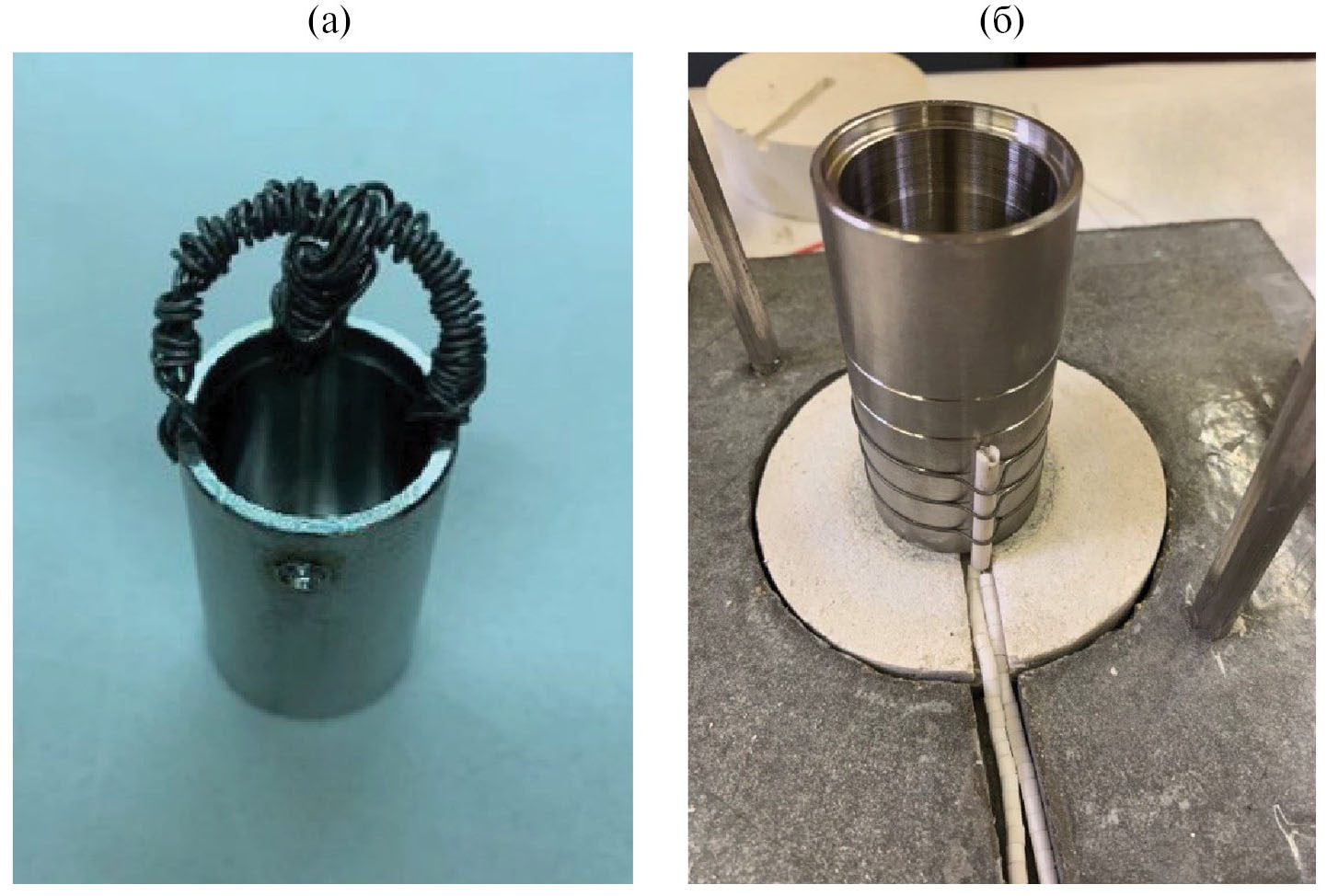 Рис. 1. Внешний вид тигля для загрузки ОЯТ (а) и реактора (б).