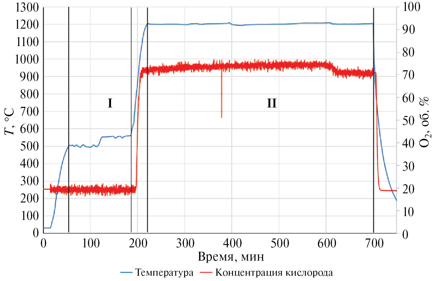 Рис. 3. Зависимость температуры и концентрации кислорода в реакционной зоне от времени.