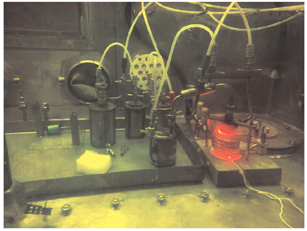 Для определения количества ПД и их распределения в локальной системе газоочистки после каждого эксперимента тигель с обработанным ОЯТ извлекали из реактора и помещали в отдельную емкость для растворения ОЯТ в азотной кислоте (8 моль/л) в течение суток при температуре 80°С. Остатки после растворения ОЯТ отделяли фильтрованием на обеззоленном фильтре «синяя лента». В рамках данной работы нерастворенные остатки не исследовали в связи с их малым количеством. Промывку всех узлов и коммуникаций газоочистки проводили азотнокислым раствором 1 моль/л (двукратно). Образующиеся растворы направляли на определение элементного состава и активности гамма-излучающих нуклидов.
