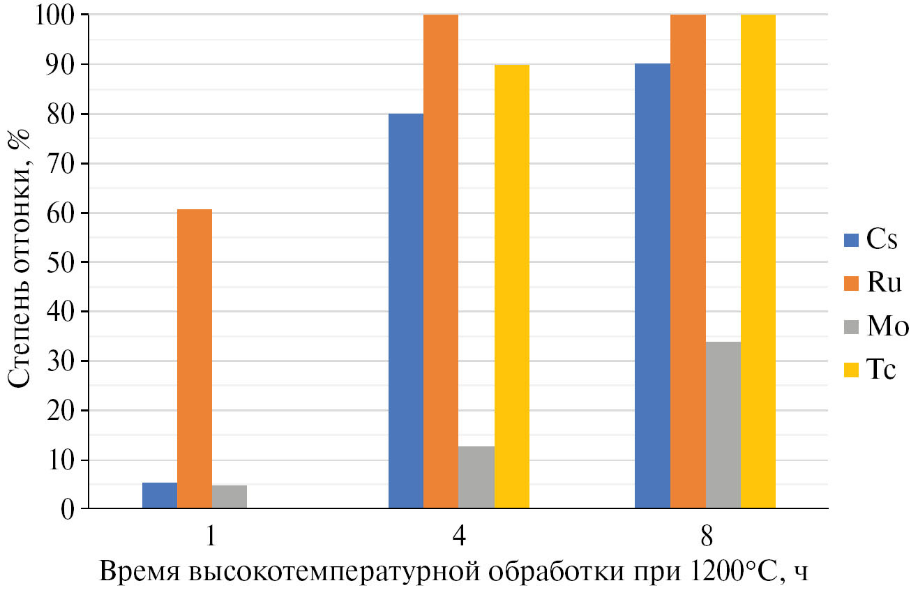 В результате выдержки ОЯТ 2 и 1 ч при температурах 500–550 → 1200°С (опыт № 1) соответственно степень отгонки составила 5% для Cs, 61% для Ru и 5% для Mo. Степень отгонки Тс в данном эксперименте не исследовали. Увеличение продолжительности второй стадии ВТО с 1 до 4 ч (опыт № 2) способствует полному удалению Ru, удалению Mo на 13% и увеличению степени отгонки Cs до 80% и Тс до 90%. В опыте № 3 за 8 ч изотермической выдержки ОЯТ при температуре 1200°С степень отгонки Cs составила 90%, Мо – 34%, а Ru и Тс – 100% (рис. 5).