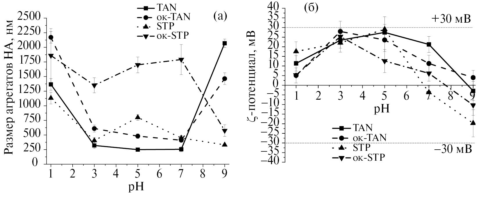 Размеры и ζ-потенциал агрегатов НА изучали в водных растворах с рН от 1 до 9; результаты представлены на рис. 1, а, б. Из данных рис. 1, а видно, что свойства суспензий НА отличаются друг от друга, а также зависят от pH и что окисление НА существенно меняет свойства их агрегатов в сравнении с неокисленными образцами. Так, при pH 1 размеры агрегатов TAN составили 2700 нм и уменьшались до 270–290 нм при pH от 5 до 7, после чего увеличивались до 3060 нм при pH 9. Размеры агрегатов ок-TAN при pH 1 соответствовали размерам TAN, но при других значениях рН они различались: при рН от 3 до 7 агрегаты были в 1.5–4 раза крупнее, а при рН 9 – меньше и составляли около 2400 нм. Что касается STP, то свойства их агрегатов существенно изменились в процессе их окисления, о чем свидетельствуют данные рис. 1, а. Размеры агрегатов STP при рН 1 составляли 2750 нм, в то время как размеры ок-STP составляли 1950 нм, а с увеличением pH до 3 размеры ок-STP существенно уменьшались – до 500 нм, а размеры ок-STP, наоборот, уменьшались незначительно, до 1250 нм. При pH от 5 до 9 размеры STP оставались не более 1000 нм, имея минимум 315 нм при pH 9, тогда как размеры ок-STP составляли от 1000 до 2000 нм при pH 5 и 7 с минимумом 640 нм при рН 9.