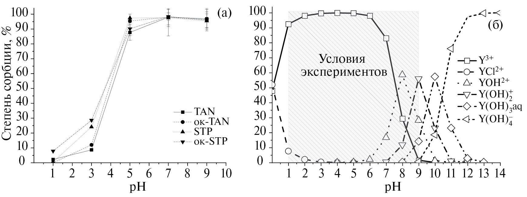Нами исследована кинетика сорбции 90Y изучаемыми НА в течение первого часа и за 24 ч. Установлено, что в каждом случае уже за 5 мин достигается сорбционное равновесие; на рис. 2, а представлены значения сорбции за 30 мин. Показано, что при рН 1 равновесные значения степени сорбции 90Y не превышают 10% для всех НА; при рН 3 TAN и ок-TAN сорбируют 10% 90Y, а STP и ок-STP – 25%. При увеличении рН до 5 сорбция становится количественной (>90%) на образцах НА и остается такой же при рН 7 и 9. Полученные зависимости степени сорбции от рН типичны для сорбции НА трехвалентных элементов, что показано нами ранее [3–7].