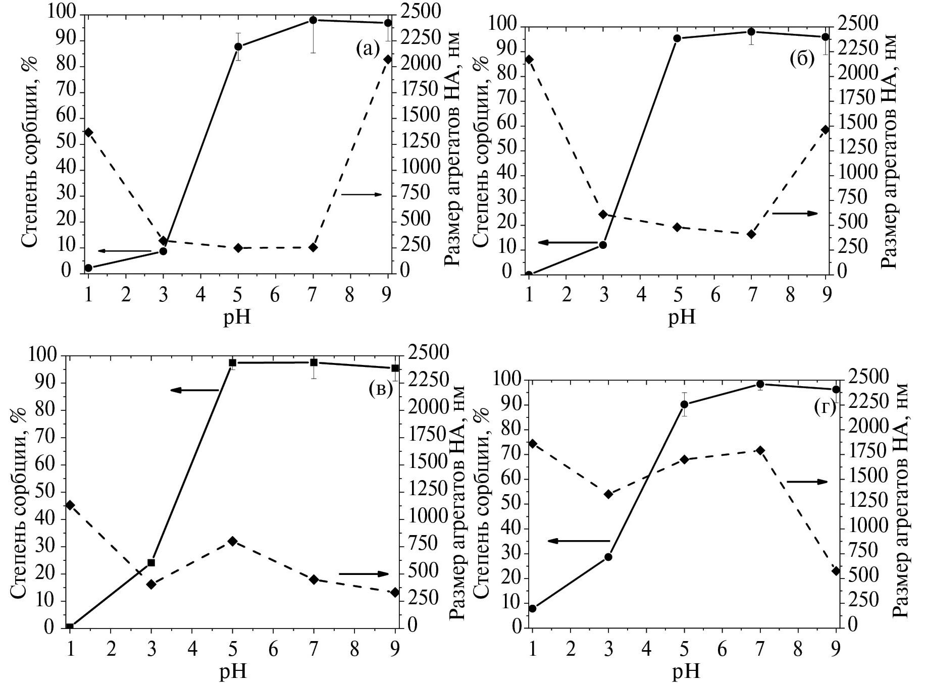 Рис. 3. Степень сорбции 90Y за 30 мин и размеры агрегатов НА в зависимости от рН образцами TAN (а), ок-TAN (б), STP (в) и ок-STP (г).