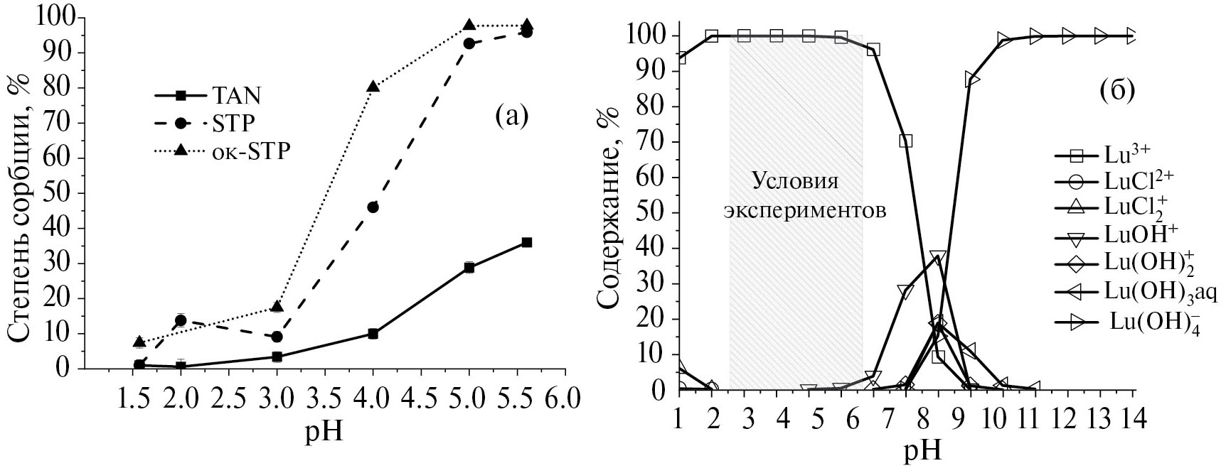Нами изучена сорбция 177Lu с носителем (20 нг/мл раствора) образцами TAN, STP, ок-STP в течение первого часа и за 15 ч при рН 1.6 от 5.6. Для всех НА установлено, что значения степени сорбции, полученные через 5 мин контакта, сохраняются в течение 60 мин. На рис. 4, а представлена степень сорбции 177Lu изучаемыми НА за 30 мин. Из данных рисунка видно, что зависимости имеют тот же вид, что и полученные ранее для 90Y, но степень сорбции в ряде случаев ниже, что обусловлено присутствием носителя. На рис. 4, б представлены формы Lu(III), рассчитанные с использованием CHEAQS [19]. При сопоставлении степени сорбции 177Lu изучаемыми НА и форм Lu(III) очевидно, что содержание различных форм Lu(III) не коррелирует со степенью сорбции. Таким образом, как и в случае с Y(III), можно предположить хемосорбцию как основной механизм связывания Lu(III) с НА.