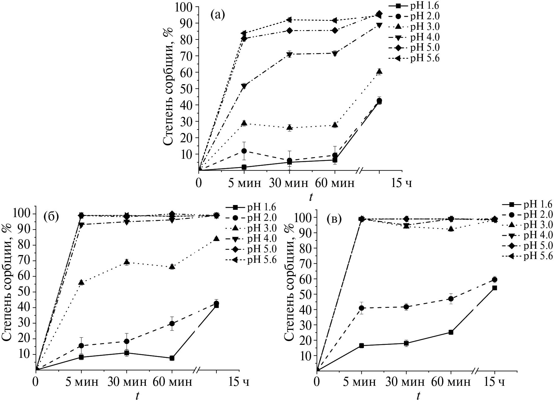 Изучали сорбцию Sc(III) образцами TAN, STP, ок-STP в растворах с pH от 1.6 до 5.6 (с учетом условий получения и использования изотопов скандия и РЗЭ в медицине) в течение первого часа контакта и через 15 ч; результаты представлены на рис. 1. Из приведенных данных видно, что для изученных образцов степень сорбции Sc(III) за 5 мин примерно равна значениям за 60 мин, при этом при дальнейшем увеличении времени контакта до 15 ч степень сорбции возрастает (если не была количественной за 60 мин). Установлено, что в изученном диапазоне рН степень сорбции Sc(III) возрастает при увеличении рН для каждого из изученных НА, что наблюдалось нами ранее при изучении сорбции Lu(III) и Y(III) теми же образцами [20].