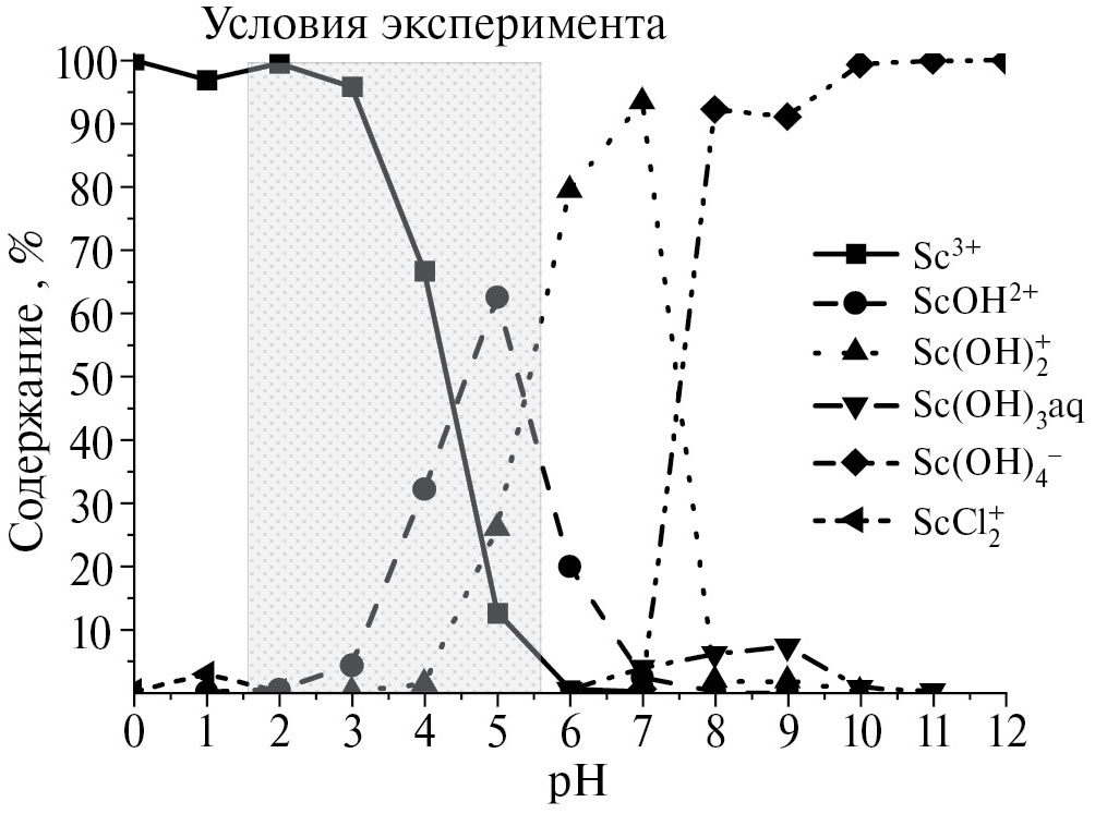 Полученные нами данные о зависимости сорбции Sc(III) агрегатами НА от рН в совокупности с данными о формах нахождения Sc(III) в растворе в условиях экспериментов позволяют в том числе предположить возможный механизм сорбции Sc(III). Для этого на рис. 2 представлены формы Sc(III) в растворах HCl, рассчитанные с использованием программы CHEAQS [21] для содержания Sc(III) 20 нг/мл, что соответствует условиям проведенных нами опытов. Из данных рисунка видно, что при рН от 1.6 до 5.6 Sc(III) находится в виде катионных форм Sc3+, ScCl2+, Sc(OH)2+ и Sc(OH)2+. В то же время нами ранее показано, что в этом диапазоне рН ζ-потенциал агрегатов всех изученных НА положителен [20]. Таким образом, количественная сорбция положительно заряженных катионных форм Sc(III) наблюдалась на НА с положительным ζ-потенциалом, и можно предположить, что основным механизмом связывания является хемосорбция. К такому же выводу пришли и авторы работы [22] при изучении сорбции Am(III) агрегатами TAN и их окисленными и восстановленными производными. Среди поверхностных групп изучаемых НА только –COH- и –COOH-группы диссоциируют в водных растворах, и они же, вероятно, взаимодействуют с катионными формами Sc(III). При этом при различных значениях pH первые могут находиться в формах –COH2+, –COH, –CO–, а последние – в формах –COOH и –COO–. Такие группы составляют, как правило, до 20% от количества всех поверхностных групп НА [23, 24]. Отметим также, что явной зависимости степени сорбции Sc(III) (рис. 1) изучаемыми НА от количества конкретных катионных форм Sc(III) в растворе (рис. 2) не наблюдается, и, таким образом, можно предположить, что эффективность сорбции агрегатами изученных НА Sc(III) из водных растворов в большей степени определяется химическим составом функциональных групп поверхности НА, чем формами скандия.